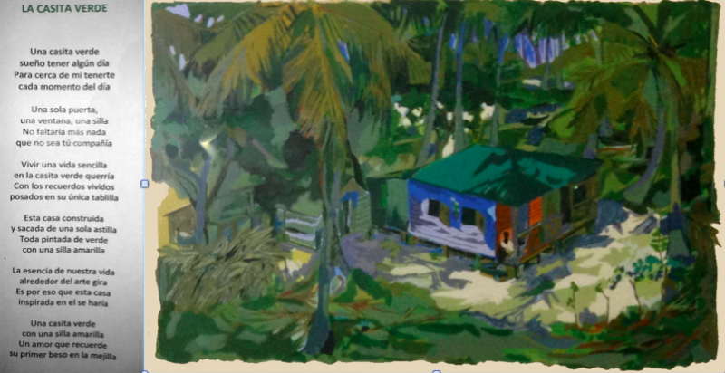 In 2013 a friend of the family wanted to sell some of her art collection. My uncle saw a painting of a simple house titled “la casita verde” by a re-known Puerto Rican artist called Rafael Tufiño. He bought it as a gift for his wife,Titi Mari's birthday. He wrote a poem in the back were he describes how he wants a “casita verde” for both of them to spend time and live simply in the moment. The first house that is going to be build in the farm is going to be based on this poem that seats in the back of this painting that hangs in their current dining room.