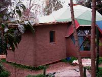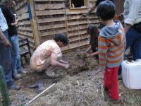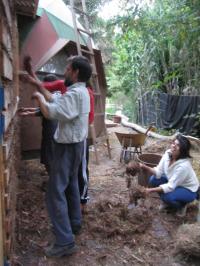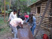 La construcción de la estructura completa fue relativamente solitaria, salvo por la colaboración de mi esposa Guru Jiwan y de una voluntaria de paso. Sin embargo tomé contacto con un grupo de estudiantes de 5° año de la escuela de arquitectura de la Universidad de La Serena que están aprendiendo en forma autogestionada y también participando de un primer curso electivo de construcción en barro que se dicta en su escuela. Con ellos, alrededor de 7 chicos y chicas realizamos la etapa de relleno de los pallets, y revoque grueso y fino en un período de alrededor de un par de meses. Para ellos fue una práctica que les abrió las puestas a un mundo que recién están conociendo. Se dieron animadas charlas sobre otros temas como alimentación, educación, salud natural, etc, además de nuestra experiencia en El Romero, que nos nutrieron mutuamente. Uno de los hermosos registros que hicieron de sus visitas es el video que esta linkeado a un costado de este texto..